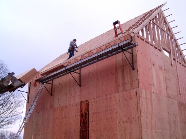 rough framing the salt box home designed by Andrew Rink Architect. The wall jacks made this project progress rapidly and safely. Here Marty is a sarting the roof sheeting.